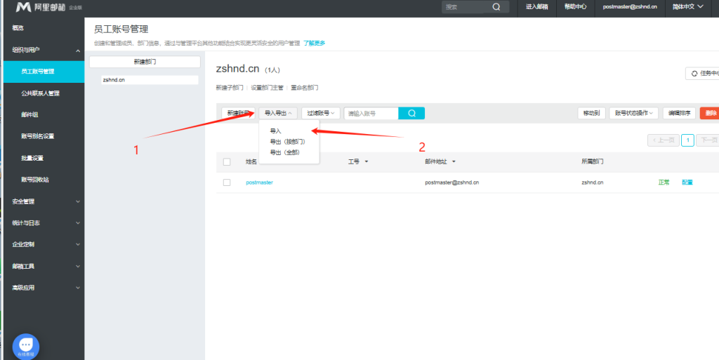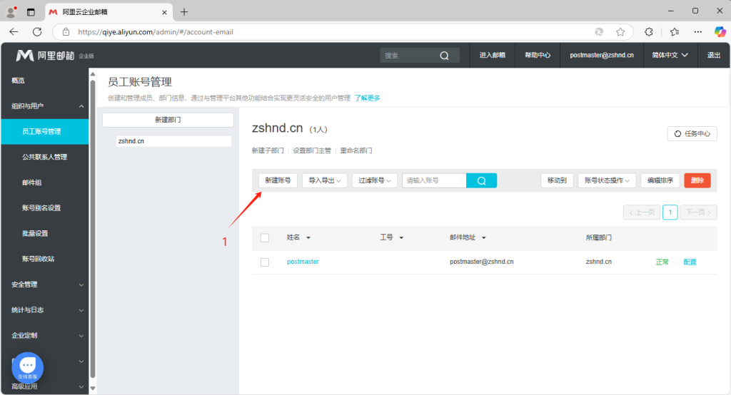 1.单个创建 点击一机分类组织与用户 在点击二级分类的员工账号管理 点击新建账号